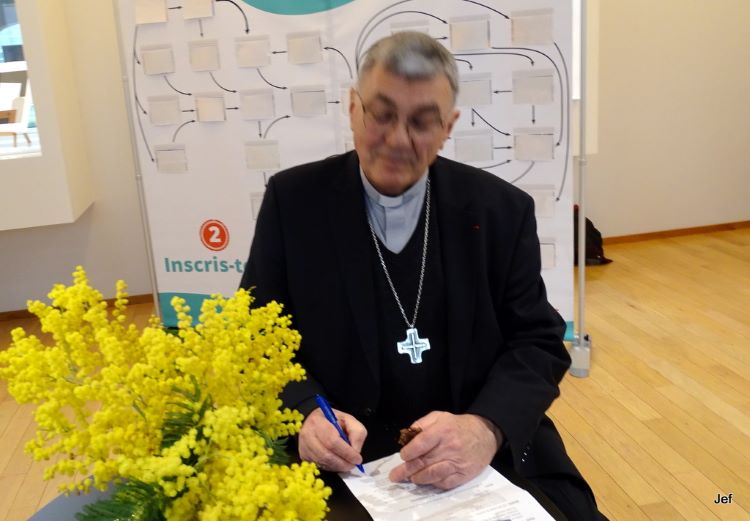 Mgr Moutel, malgré des obligations urgentes qui l’obligeaient à partir, a pris le temps de saluer tous ceux qui arrivaient dans le grand hall de la Maison où les organisateurs tenaient leur stand d’informations. C’est avec sa parole d’encouragement qu’a commencé la journée.