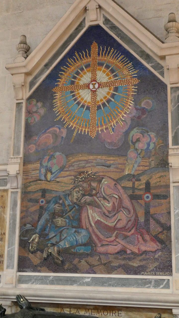 Après quoi nous nous dirigeons vers la Cathédrale non loin de là. Nous admirons d’abord les deux gracieuses flèches avec le Roi Gradlon au milieu, mais il ne daigne pas descendre de son cheval pour nous saluer ! Le joyau de l’art gothique en granit est d’autant plus beau qu’il a bénéficié dernièrement de travaux de restauration. Quand on y entre, on est saisi par la longueur et la hauteur de la nef, ses piliers majestueux, ses nombreux oratoires dont l’un était jadis réservé aux lépreux, les gisants des Évêques, le grand chœur où se trouve la cathèdre (siège de l’Évêque), et bien sûr, la statue du fameux Santig Du. La corbeille, à ses pieds, est vide, mais au moment de sortir, nous voyons un homme arriver avec un pain sous le bras : un SDF pourra se servir… Nous remarquons également un vitrail représentant le Christ se penchant sur un soldat blessé : c’était un croquis dessiné par le Père Jean-Marie Conseil -de la famille de Srs Françoise et Anne-Marie, originaire de Cléder-, prêtre brancardier pendant la Grande Guerre, tué en 1916 sur le champ de bataille en allant secourir un blessé…