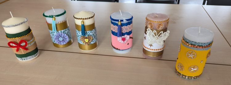 Stimulées par l’effet de « nos jeux olympiques » de cet été, nous commençons par un atelier de décorations de bougies. Chacune y va de son inspiration et de ses possibilités : au final, le résultat est très satisfaisant et nous avons passé un très bon moment ensemble…