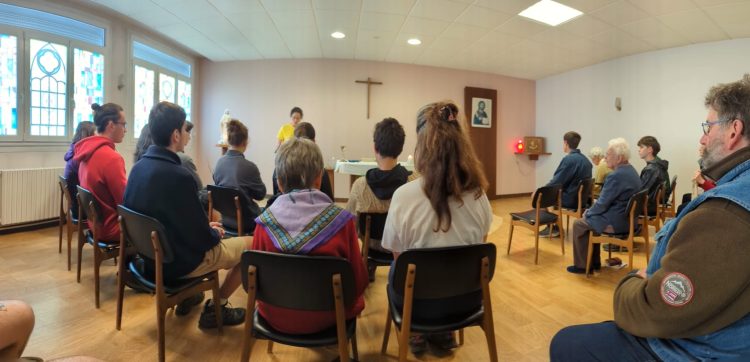Les chaises en demi-cercle, nous nous réinstallons et chacun, sœurs et invités, devons nous présenter… et nous mettons des prénoms sur tous les visages : c’est Emmanuelle, Thomas, Maxence, Victor, Caroline, Myriam, Samuel, Ronan, Noa etc. Ronan, l’animateur du groupe, nous parle longuement de son projet qu’il mène avec les jeunes de Quimperlé depuis près de 30 ans…