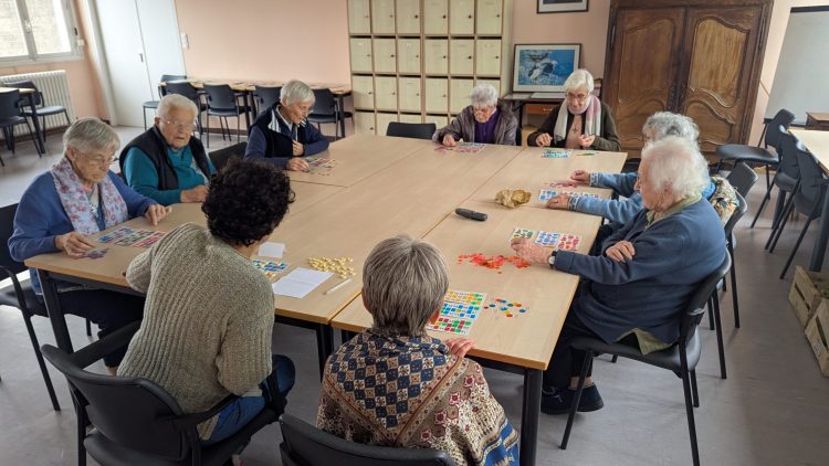 Marie- Christine, en maître de jeu, annonce les numéros qu’elle tire du sac ! et chacune recherche si celui-ci est sur un de ses trois cartons… C’est sérieux ! le silence règne, troublé de temps en temps par « Ah, je l’ai… j’ai une ligne pleine, un de mes cartons est rempli ! » des éclats de rire ! Des exclamations ! L’ambiance est là !