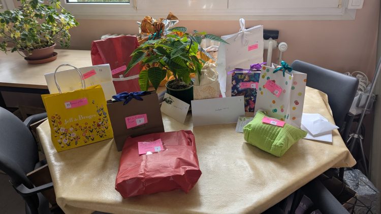 C’est qu’elle préparait secrètement ce loto depuis un certain temps… elle est donc partie en quête de lots et s’est présentée chez les commerçants d’Elven, dont nous sommes clients réguliers. Partout où elle s’est présentée, elle a été très bien reçue et chacun a joué le jeu : aux boulangeries : des pâtisseries, des brioches ; à la maison de la presse : des livres de poche ; à la pharmacie : des crèmes et des shampoings ; au petit carrefour market : un panier garni… etc.