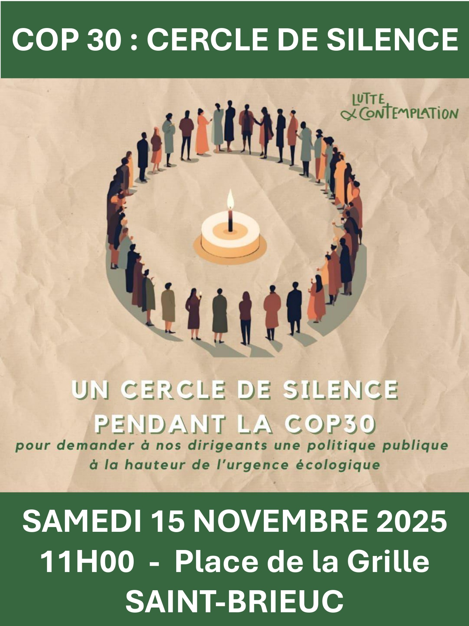 Des collectifs (équipe diocésaine « Laudato Si », CMR, CVX, CCFD, « église verte ») ont en effet organisé ce « cercle » en écho à la Déclaration des Représentants des Cultes en France, à l’occasion de la COP 30. Sous un ciel gris qui déversait généreusement son crachin, nous sommes restés dans un silence absolu, à côté du marché qui battait son plein et d’un manège, la joie des enfants, qui respectait notre silence… Notre silence, comme une prière vers le Seigneur de l’Univers pour les décideurs rassemblés en cette période à Bélem… Notre silence, comme un cri implorant plus de justice et de fraternité universelle !