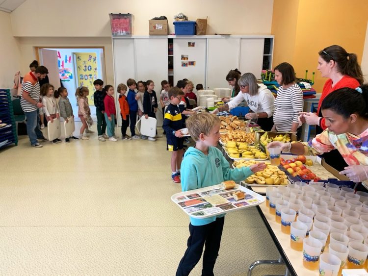 Ce matin-là, nous sommes accueillies dans une entrée de l’école comme dans une attente de self… et quel n’est pas aussitôt notre émerveillement de découvrir les plus petits de la maternelle, déjà bien en rang, s’avancer vers les personnes qui tiennent les distributions du « Petit déjeuner » : chocolat, lait, jus de fruits, pain avec beurre ou confiture, fruits, yaourt… Puis, à nos yeux ébahis, nous les voyons repartir tenant chacun, au mieux de leur taille, leur plateau de « Petit déjeuner » qu’avec précaution quelques parents viennent retenir !