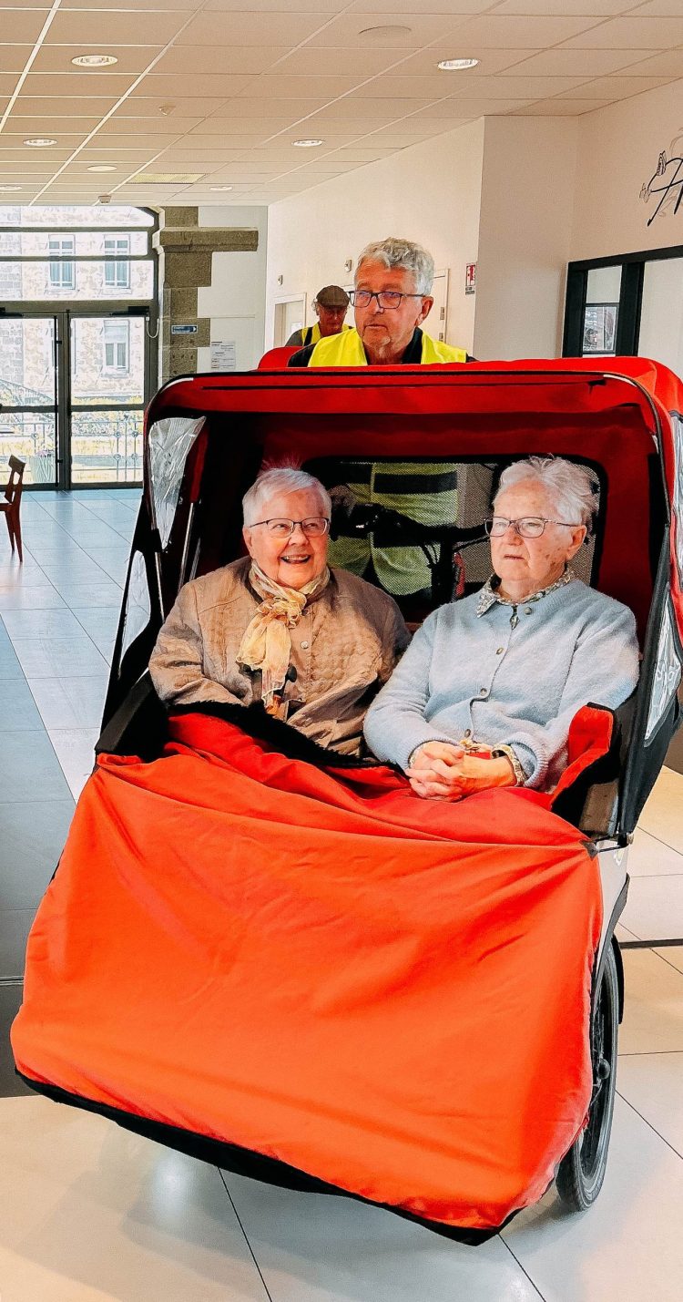 Des hommes qui aiment le vélo et adorent faire plaisir se sont regroupés pour offrir aux personnes âgées ou à mobilité réduite, vivant en établissement ou à domicile, une promenade agréable, accessible en vélo. Deux genres de voiturettes, des triporteurs nous attendent. Ils offrent deux places abritées du vent ou de l’excès de soleil. Nous voici attachées, bien sécurisées, enveloppées de couvertures la tête sous une capote,… un peu comme dans les poussettes pour bébés. Derrière nous, un homme enfourche le vélo attenant à ce fauteuil sur roues et… en route !