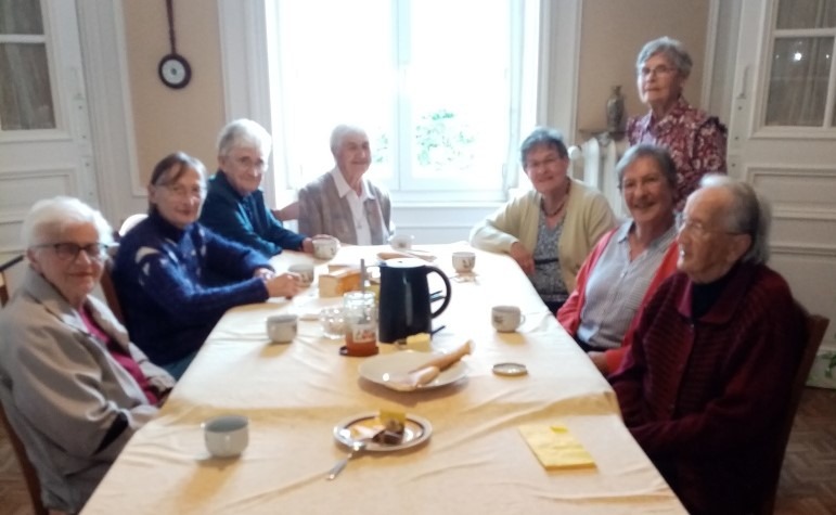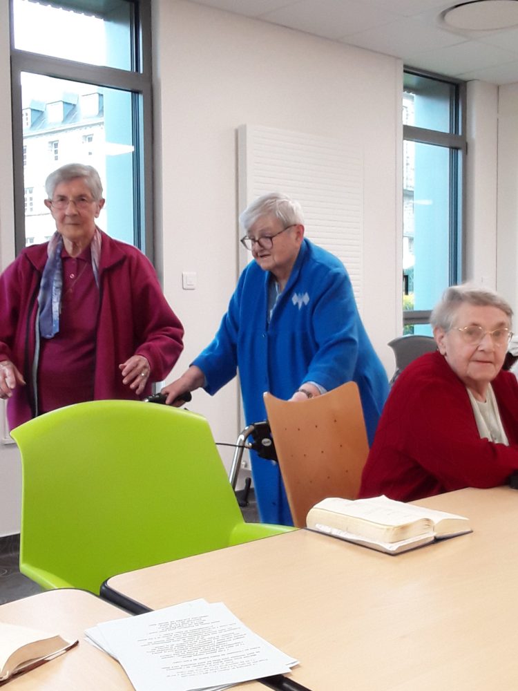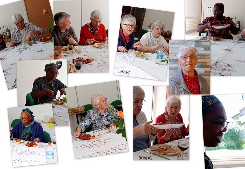 Avant le déjeuner, nous avons organisé un apéritif pour remercier Christiane RANNOU d’avoir assuré pendant de nombreuses années la responsabilité de modératrice régionale. Ainsi que Marie-Thérèse MOCHET, qui depuis 2007 s’est chargée de la rédaction du journal « Porté par le vent ». Ce fut un beau moment où les sœurs de la congrégation nous ont rejointes.