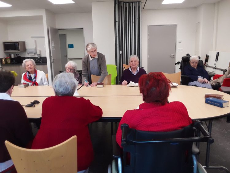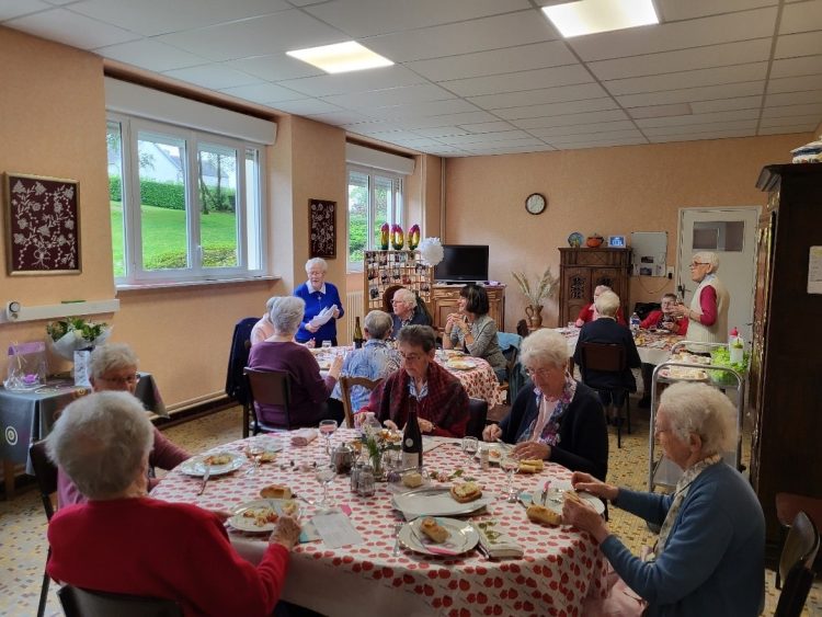 Chaque semaine la Messe réunit une quarantaine de résidents (sur 60 pensionnaires) dans une salle à manger transformée en Chapelle grâce à la participation active et efficace d’un personnel très bienveillant qui veille à ce que tous ceux qui le désirent assistent à la célébration.