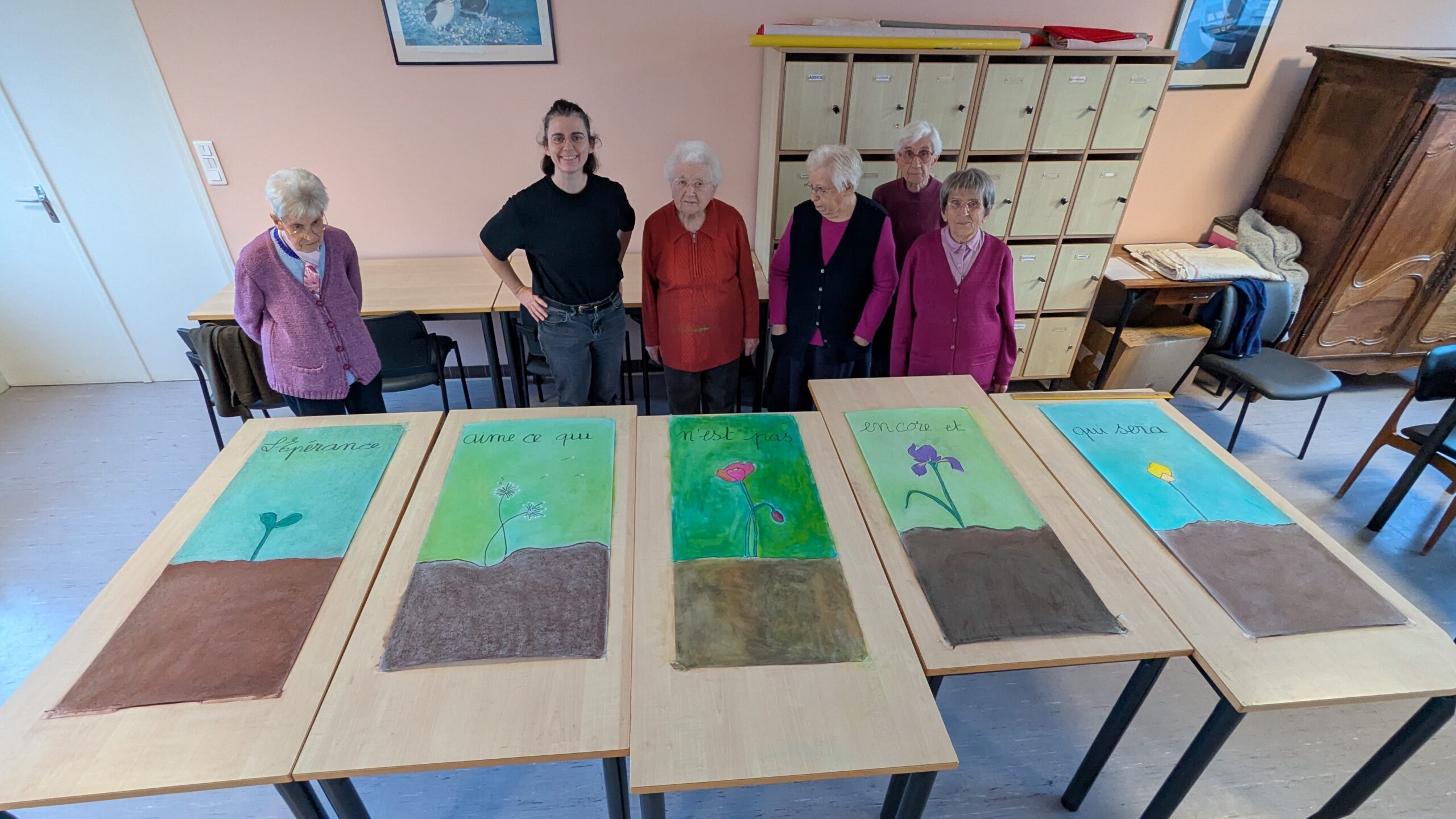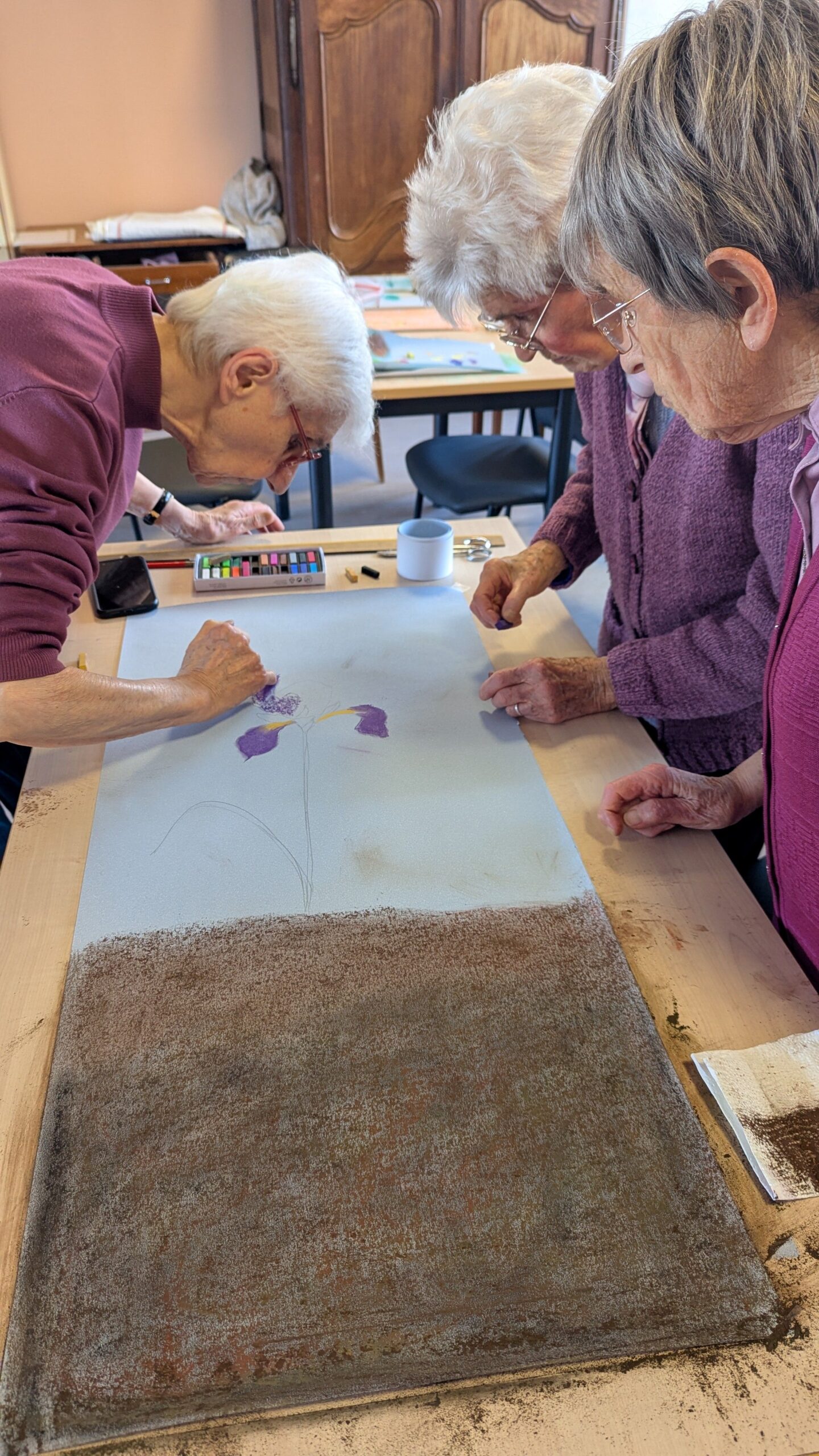 C’est avec beaucoup de sérieux, guidées par Solen — aux doigts de fée — que nous nous sommes mises à peindre au pastel ou à la gouache, et que nous nous sommes appliquées à réaliser un « petit chef-d’œuvre » (à notre avis !). Pour plusieurs d’entre nous, cela faisait une éternité qu’elles n’avaient pas touché un pinceau ! Mais il reste tout de même de beaux restes… »