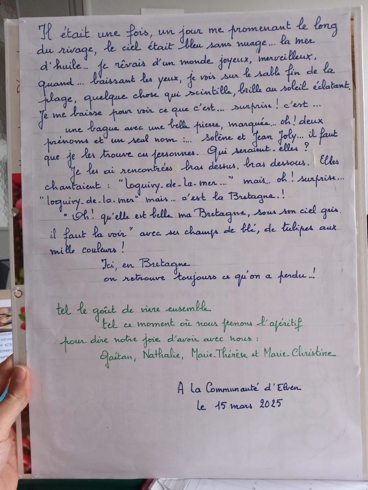 Chacune a contribué à l’élaboration d’un récit, ajoutant une phrase, un rebondissement ou une touche personnelle. Ce travail collectif a abouti à une belle séance de lecture avec les salariés. Gaétan nous a fait la surprise de chanter « une blanche hermine », accompagné de sa guitare.