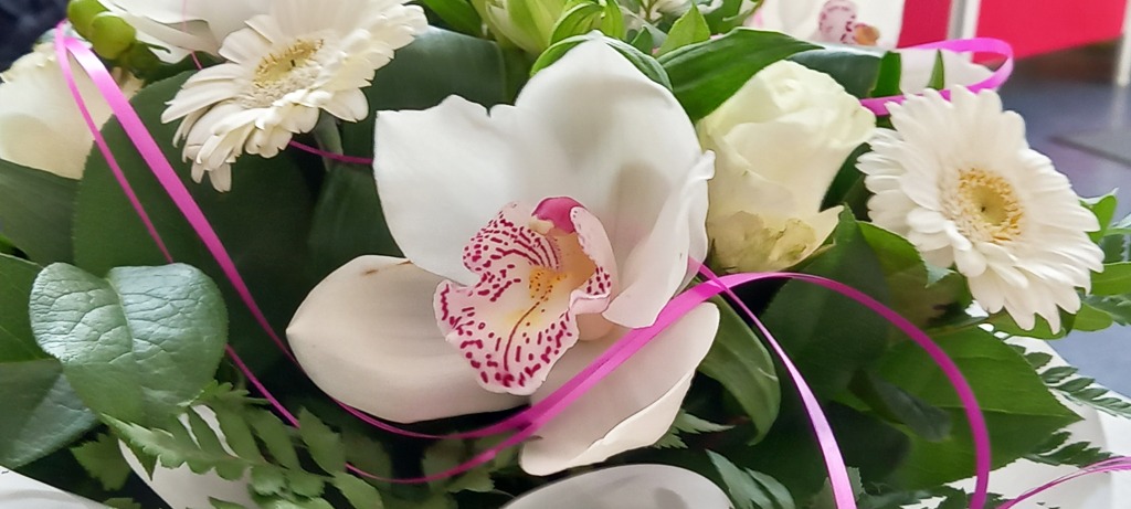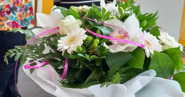 Un repas nous attendait à l’école Saint Julien : accueillies par la directrice, ce moment tout simple de fraternité conviviale regroupait des prêtres amis et ceux de la paroisse, quelques paroissiens qui ont beaucoup œuvré avec les Filles du Saint-Esprit. Heureux temps de partage et d’échanges ! Pour clore tout cela, le diacre Philippe remettait un magnifique bouquet de fleurs à Philo, geste symbolique accompagné verbalement du MERCI de la paroisse et de la cité aux Filles du Saint-Esprit pour l’œuvre accomplie.