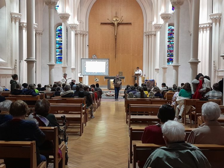La journée ne pouvait pas se conclure sans un temps de prière commune « pour rendre grâce, pour se préparer à l’assemblée dominicale du lendemain » à laquelle l’Evêque invitait chacun à y participer. Chants de louange… Un moment très symbolique avant la proclamation de la parole de Dieu et qui consonait très fort avec la journée : la transmission du Livre de la Parole de main en main, d’une génération à l’autre, d’une culture à l’autre. Nous pouvions ensuite recueillir la parole de l’Évêque nous exhortant à « aller, inviter à la noce, horizon de la Mission » car, « Dieu est toujours en sortie pour tout homme, malgré l’indifférence et le refus ».