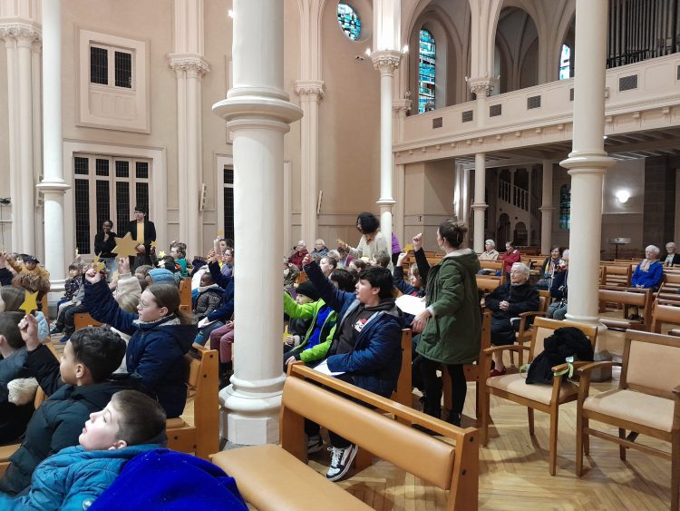 Par groupes, ils viennent devant l’autel et, déjà entraînés au micro, ils disent comment ils ont préparé Noël : gestes de partage, de service, d’entraide, de pardon. « J’ai quelque chose à vous raconter… Vous voulez savoir quoi ? »