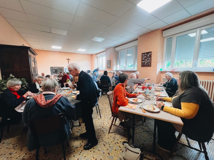 Le 9 décembre, nous sommes treize, neuf résidentes de la Maison Jeanne Guernion (dont huit sœurs) et quatre accompagnatrices à prendre la direction de Plonévez-du-Faou. Nous avons rendez-vous avec les sœurs de la communauté de Plonévez-du-Faou pour le déjeuner avant de nous rendre au château de Trévarez situé non loin de là. Peggy, coordinatrice de la communauté, et les sœurs nous accueillent avec joie. La table est prête. Les retrouvailles sont chaleureuses et les sourires sur tous les visages. Les discussions vont bon train pendant le repas, fort apprécié par toutes.